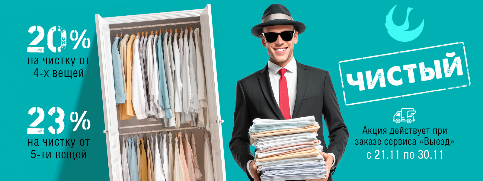 1. Размер скидки составляет 20% и 23% и распространяется на заказ услуги химчистки всего ассортимента от 4-х или 5-ти и более изделий.