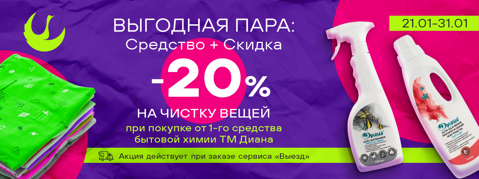 Главное условие Акции: скидка 20% на заказ химчистки изделий на выезде при покупке любого средства бытовой химии ТМ Диана